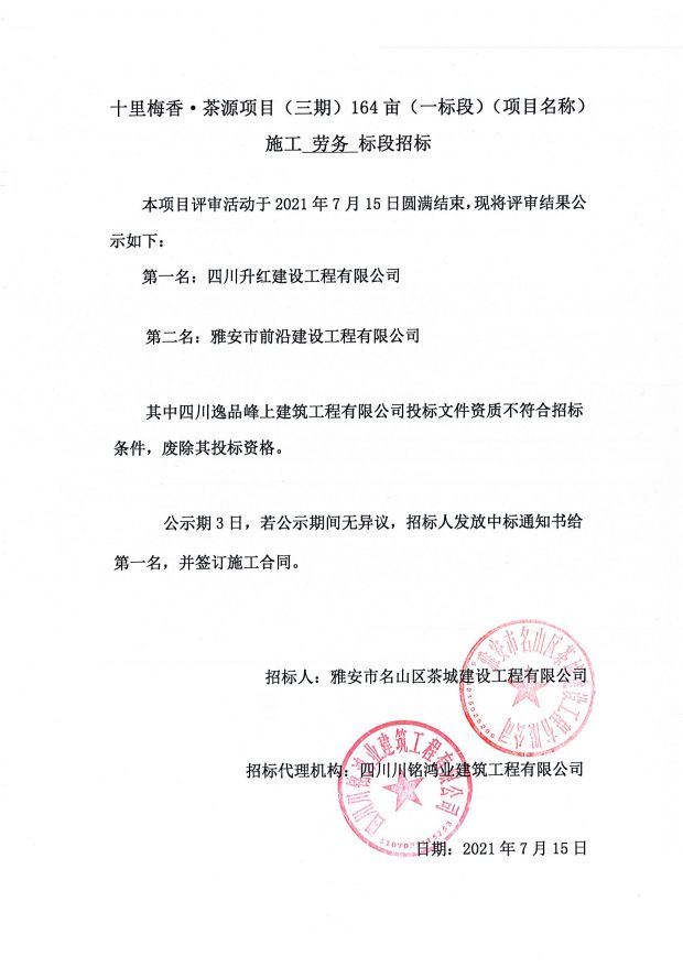 十里梅香茶源項(xiàng)目(三期)164畝施工總承包一標(biāo)段施工勞務(wù)標(biāo)段評(píng)審公告
