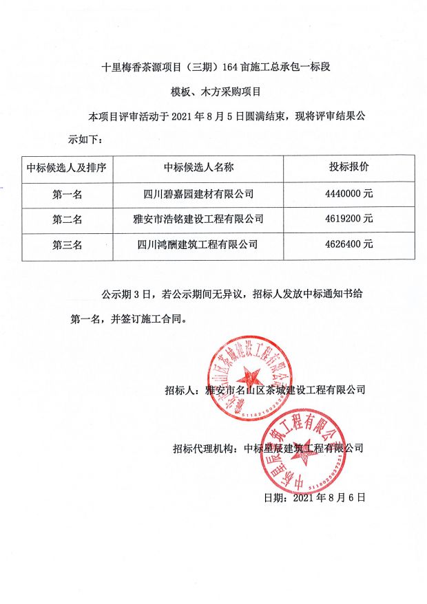 十里梅香茶源小鎮(zhèn)(三期)164畝施工總承包一標(biāo)段模板、木方采購(gòu)中標(biāo)公示