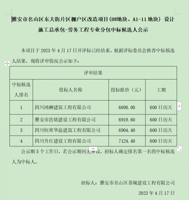 雅安市名山區(qū)東大街片區(qū)棚戶區(qū)改造項目(8#地塊、A1-11地塊) 設計施工總承包-勞務工程專業(yè)分包中標候選人公示