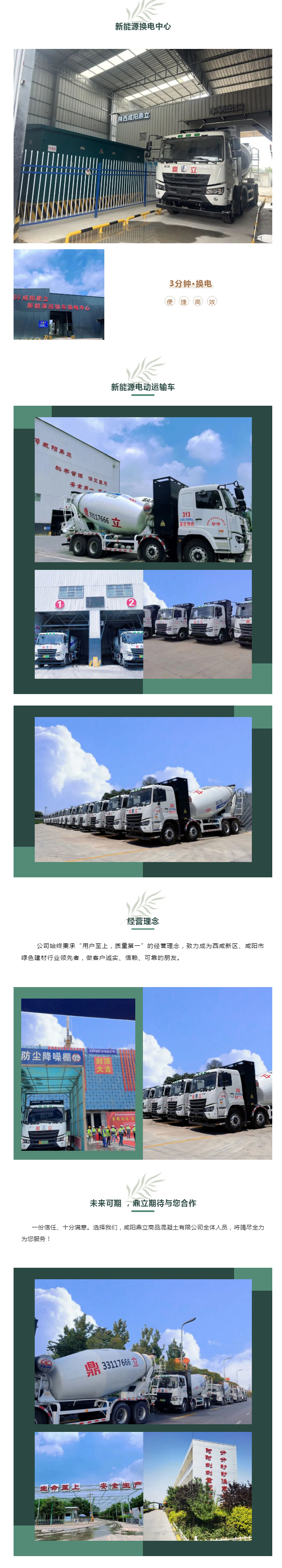 為響應(yīng)國家“十四五”發(fā)展規(guī)劃,順應(yīng)“能源革命”潮流,圍繞“碳達(dá)峰、碳中和”目標(biāo)和“建立健全綠色低碳循環(huán)發(fā)展經(jīng)濟(jì)體系”國家戰(zhàn)略,建設(shè)綠色環(huán)保型企業(yè),我公司于2023年3月開始,建設(shè)了新能源運(yùn)輸車換電中心,啟用了新能源電動攪拌運(yùn)輸車40余輛,加上之前使用的2臺電動裝載機(jī),使整個生產(chǎn)區(qū)域達(dá)到綠色、環(huán)保、低碳、零排放標(biāo)準(zhǔn)。